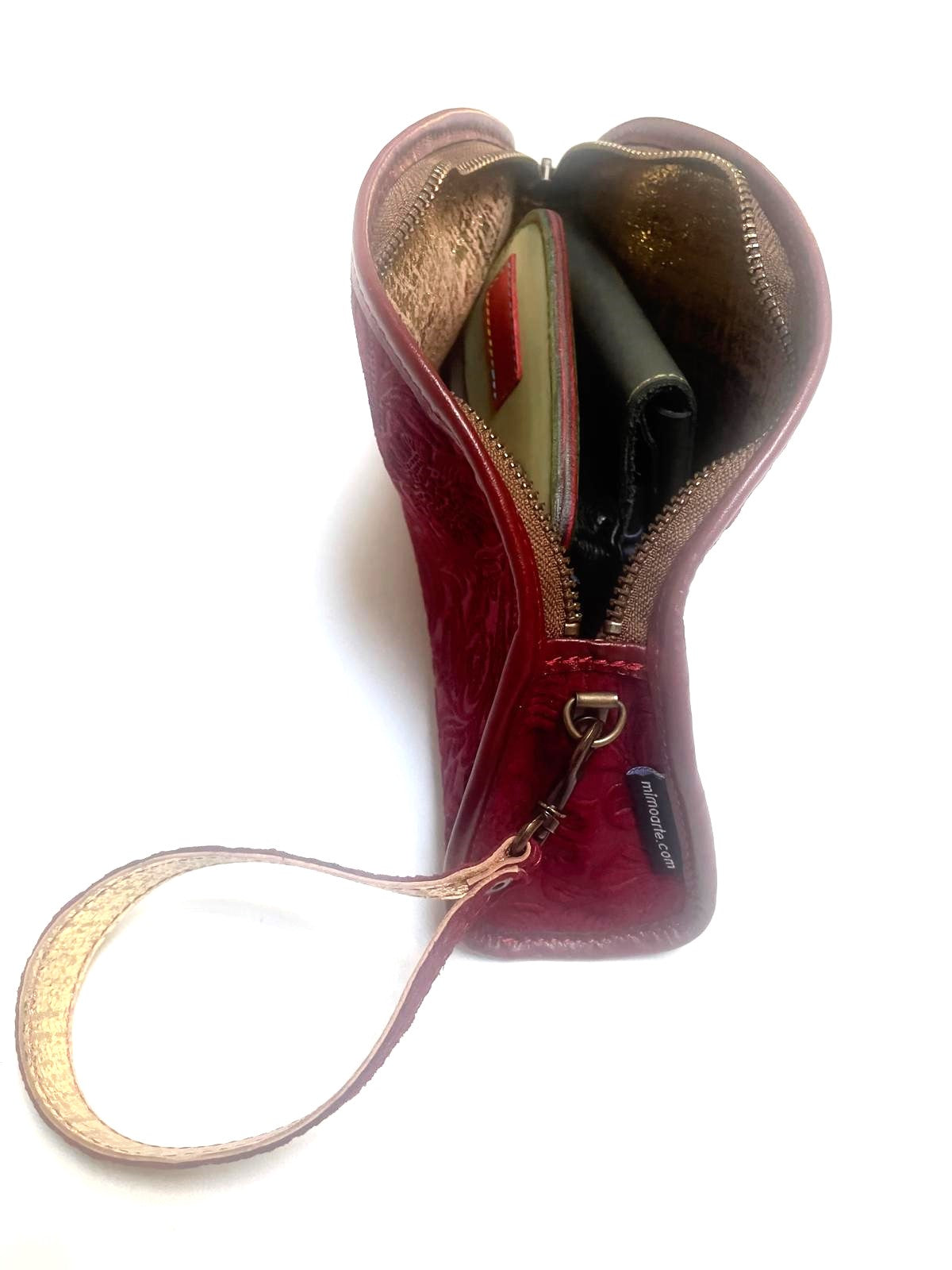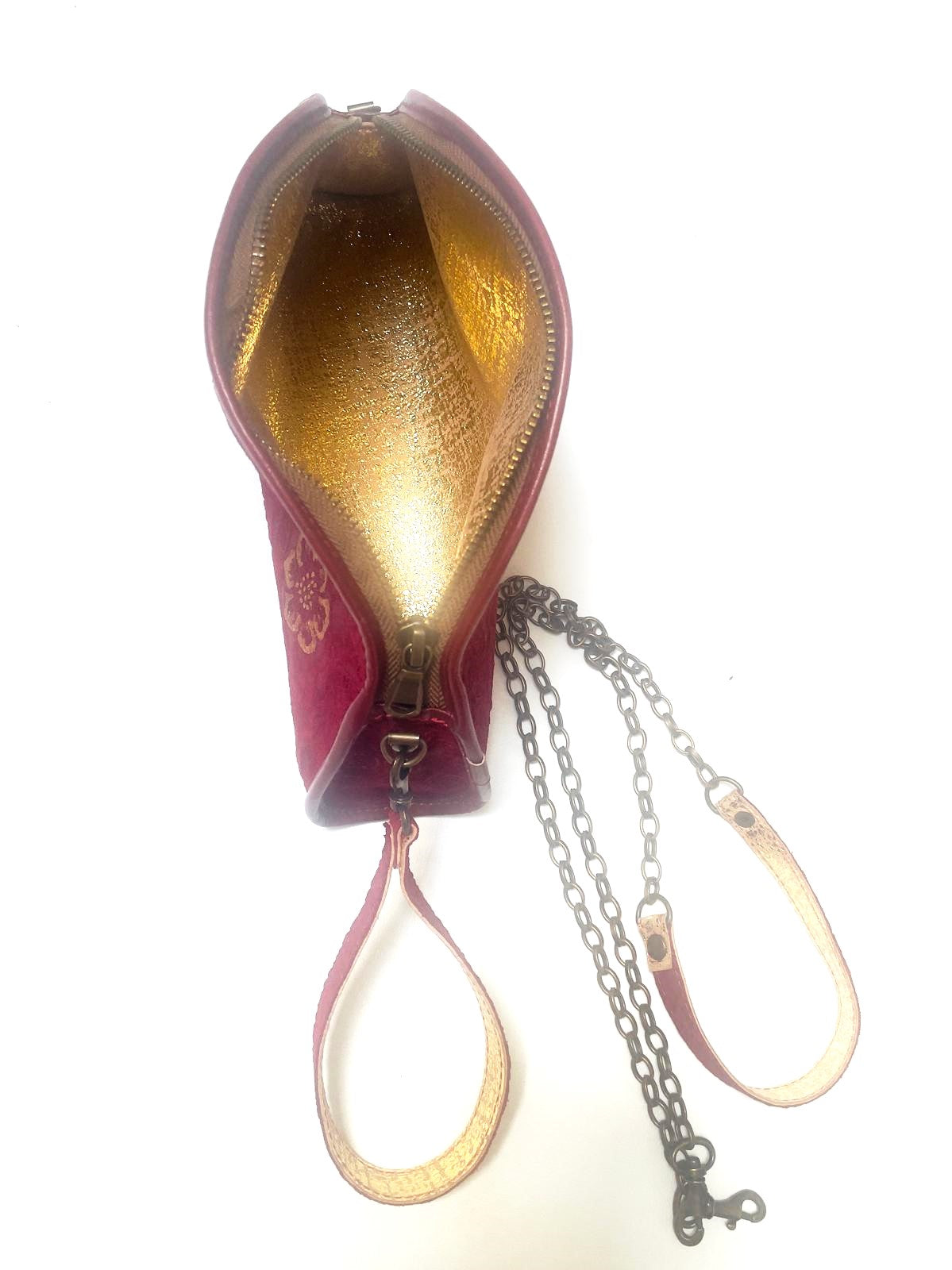 Feita artesanalmente em pele com aplicações também em pele. As aplicações podem conter outros materiais como por exemplo tecidos,